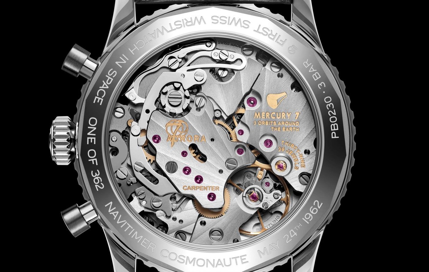 Another is its open sapphire crystal caseback that provides a window on the B02 movement with its special bridge engravings to mark the occasion: the words “Carpenter,” “Aurora 7,” and “3 orbits around the Earth,” along with the name of the original group of seven astronauts chosen for NASA’s first human-crewed spaceflights, Mercury 7.
