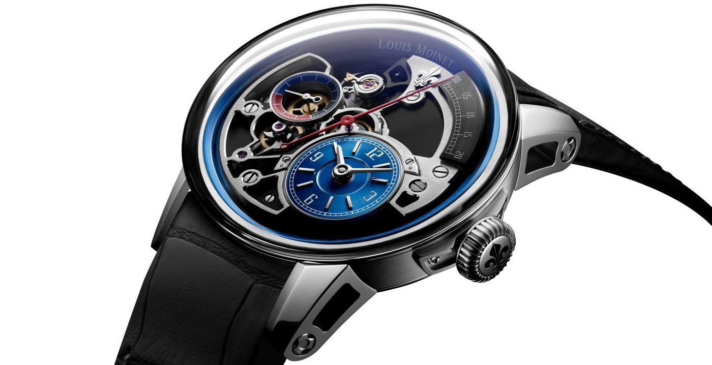 The care devoted to the aerodynamic treatment of the Tempograph Spirit’s design began with the integration of a new, more fluid crown guard. The flanks have been given a facelift, with openworked lugs topped by a subtle satin-finish camber accentuating the integration of the bracelet. The lugs are tipped with Louis Moinet’s emblematic signature, four black zircons featuring chatons held by screws.