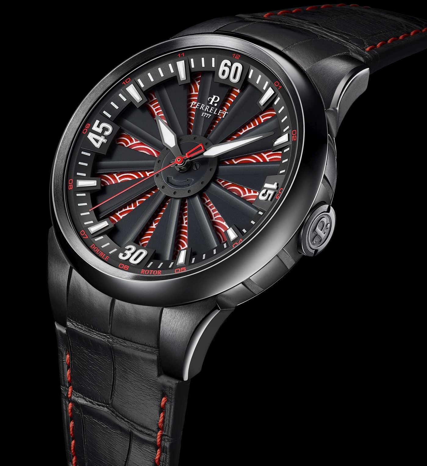 - Black alligator strap with red stitching equipped with black PVD treated steel folding clasp and Perrelet logo