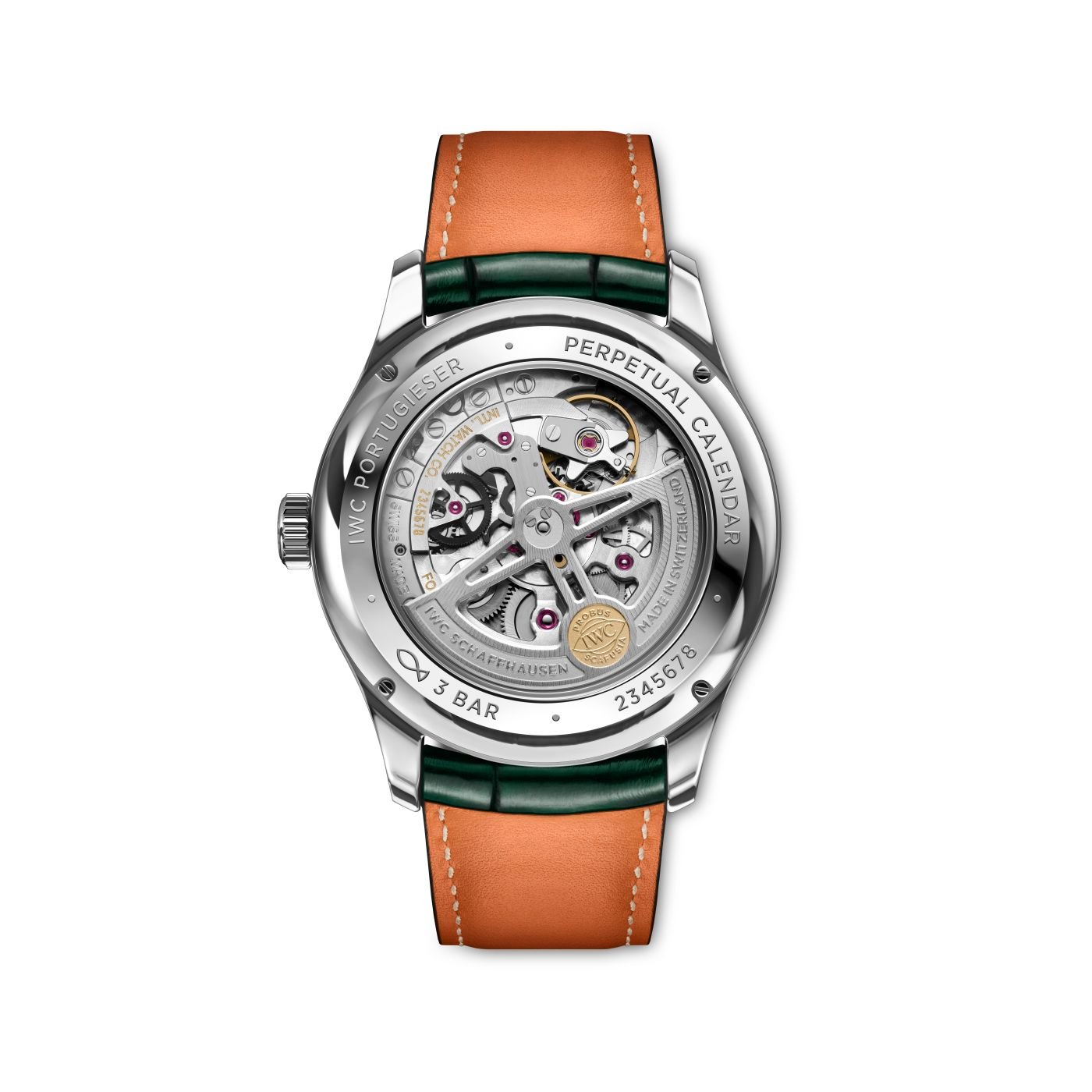 At work inside the stainless steel case is the IWC-manufactured 82650 calibre with Pellaton winding system and components made of virtually wear-free zirconium oxide ceramic. The movement with a power reserve of 60 hours is visible through the sapphire glass case back. IWC’s legendary perpetual calendar was initially developed by former head watchmaker Kurt Klaus in the 1980s. The mechanical program automatically recognises the different lengths of the months and the leap years and needs no manual adjustment until 2100. In addition, the perpetual moon phase display is so precise that it only deviates from the orbit of Earth’s satellite by one day every 577.5 years.