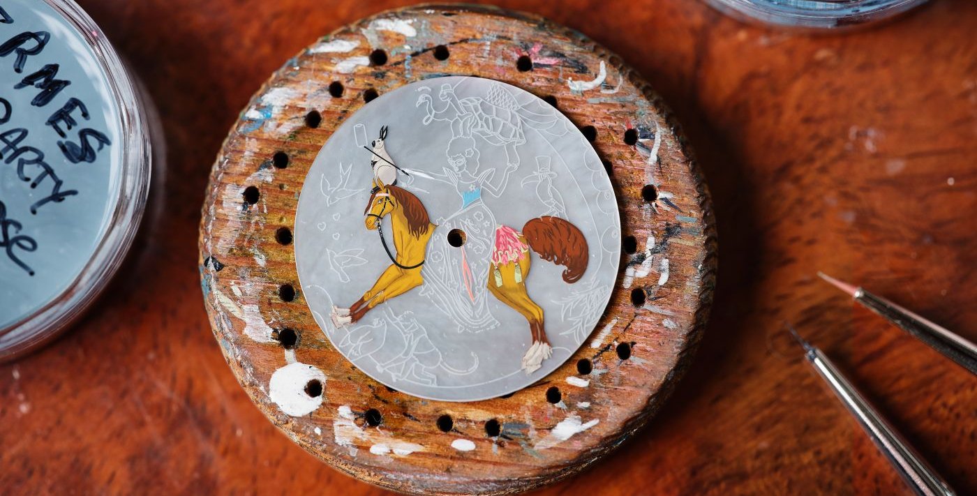 Another scene, another craft: a white gold version in a 24-piece limited and numbered edition features miniature painting on mother-of-pearl. Varnished, polished and smoothed by hand, it is adorned with 20 or so layers of multiple colours designed to reveal its subtle nuances and shimmering reflections. Eight days and a few firings in the oven later, the magic happens: the princess appears on her wooden horse at the heart of an animal circle where toucan, turtle, peacock, swallow and rabbit vie for the best spot in a countryside selfie.