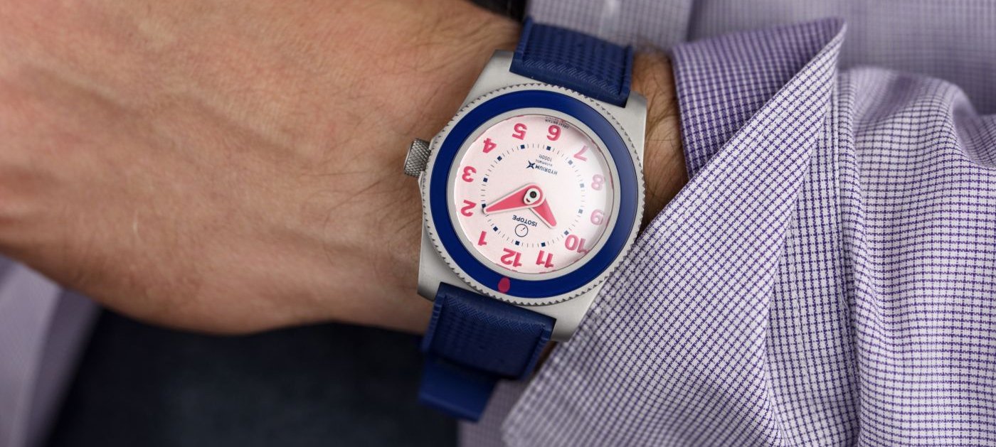 “By combining these two colours, which are traditionally used to designate each sex, you get a watch for everybody,” states the brand. “While it shares the familiar design of the now sold-out Isotope Hydrium™ X Will Return, the blue and pink add a new dimension. Despite being meant to be worn casually, the Isotope Hydrium™ X Blink is a competent diving watch featuring a 40mm large case made from 316L stainless steel with a micro-blasted finish, double-domed anti-reflective sapphire crystal, unidirectional sapphire bezel with 120 clicks, and a screw-down crown.”