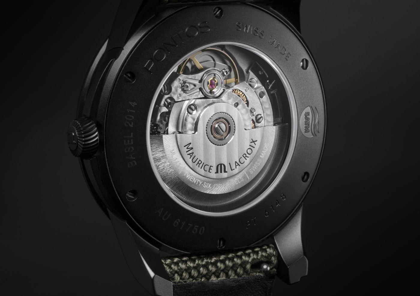 At the top of the dial, the Maurice Lacroix ‘M’ logo looks down on the rest of the display, once again, dressed in black, understated and cool. Throughout the composition, the dial plays with different textures, finishes, hues and depths. For example, the day is shown via an arcing aperture. It’s presented in white text atop a black disc, recessed but eminently clear. This treatment is repeated in the lower part of the dial, where the date is shown via a recessed square aperture, legible and sophisticated. The central sweep seconds hand features a prominent tip which floats above the minute track, thereby augmenting readability.