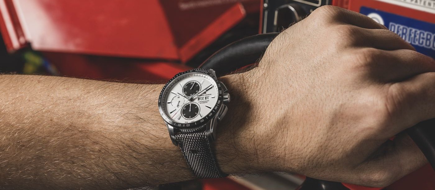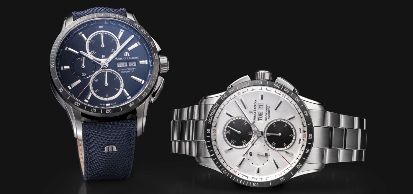 Maurice Lacroix has retained some design elements found on former models such as the elongated pushpieces and the distinctive double-stepped lugs. The case juxtaposes satin-brushed and polished surfaces, delivering contrast and a notable sense of style. To the rear of the watch, a pane of sapphire crystal affords sight of the automatic ML112 calibre. Upholding Maurice Lacroix’s reputation for delivering high-perceived value, the movement is appointed with a combination of Côtes de Genève, perlage and sunbrush decoration.