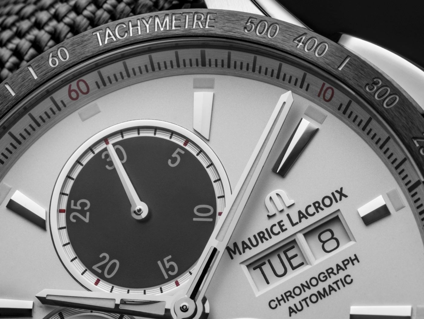 At first glance, the dial appears to have just two counters, arranged along a north-south axis. However, closer examination reveals there is a small seconds display at 9 o’clock and a day and date display positioned opposite, all of which prove simple to read. The dominant counters comprise a 30-minute register at 12 o’clock and a 12-hour register below, each endowed with sandblasted centres and framed with snailed detail. The Maurice Lacroix design team have enriched the composition with numerous elements, presenting dial components at different heights and judiciously using colours in order to enrich the ownership experience.