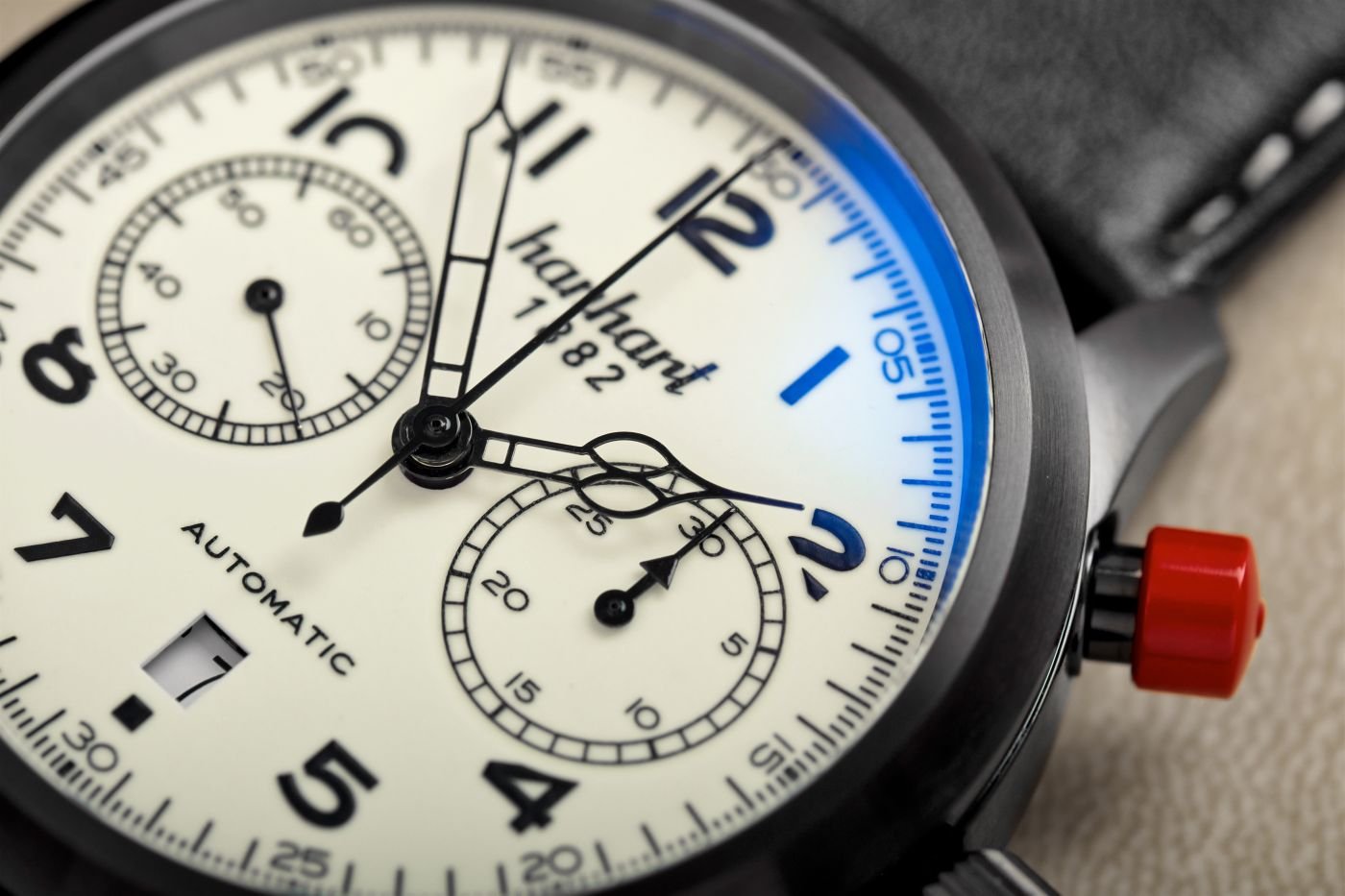 The black DLC-coated case with red pusher completes the special design of the timepiece. Despite the new look, the typical Hanhart features are also unmistakable in this chronograph: bi-compax dial layout, large pilot’s crown and red pusher.