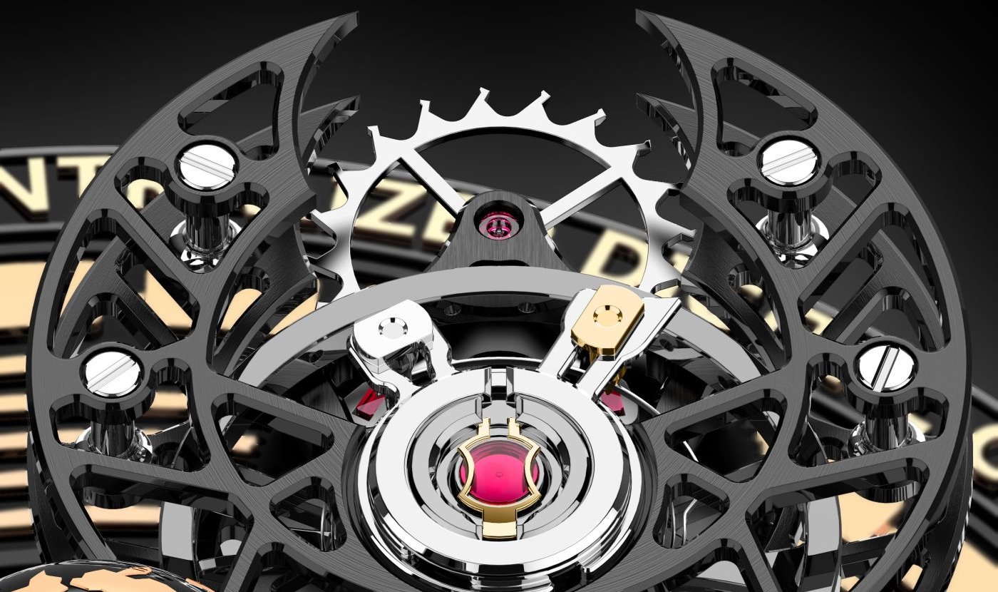 - Structure: Vertical movement with 3 arms, full revolution in 10 minutes; flying tourbillon; hours and minutes dial with patented differential to keep the 12/6 o’clock position; frame carrying custom Bitcoin decor, one 288-facet Jacob-cut Diamond (1ct.) and one Jacob-cut orange citrine ( 1.57 ct.); Bitcoin logo with 60-sec. rotation black terrestrial globe on top of the movement base with positive-engraving decor rotating counter-clockwise in 11 minutes