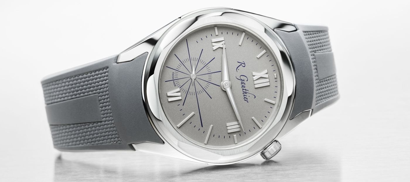 The dial is available in grey and highlighted with blue details, or in blue highlighted with white details. Romain explains this purposeful play on perspective, saying: “Rather than a series of enclosed circles, as we often see in watchmaking, I wanted an open, airy dial on which full or part orthogonal lines form vanishing points with the axes of the hands, reinforcing the notion of continuity and freedom.”