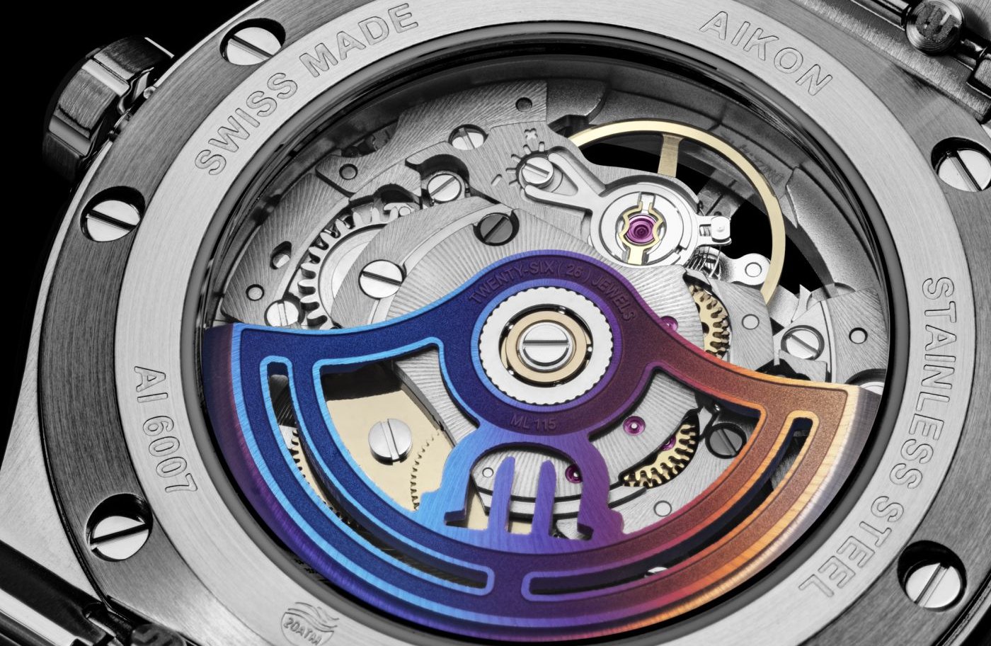 aunched in 2016, the Aikon has become a byword for urban style. The inaugural model was quartz, but the collection soon grew to encompass numerous mechanical watches incorporating a variety of complications. In this instance, the brand from the Swiss Jura has created a unique piece, employing a skeleton movement as an ar tistic canvas, enriched with a myriad of hues. Luminescent hour and minute hands, along with a slim central sweep seconds hand, float above a sapphire dial and collaborate with indexes, once again luminescent, to indicate the prevailing time.