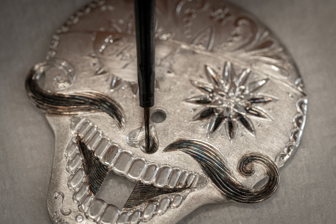 Finally, the engraver coats the dial surface with a thin layer of silver, which is oxidised with ether to blacken the hollows and accentuate the patterns. When the artisan applies the ether with a brush, the liquid spreads over the surface and the raised surfaces are then retouched to ensure that only the hollows are blackened by oxidation. The richly detailed dial thus comes to life under the humble and sensitive gaze of the artisan. Patience, constancy and meticulous care were essential in the creation of this dial, which took four weeks to complete.