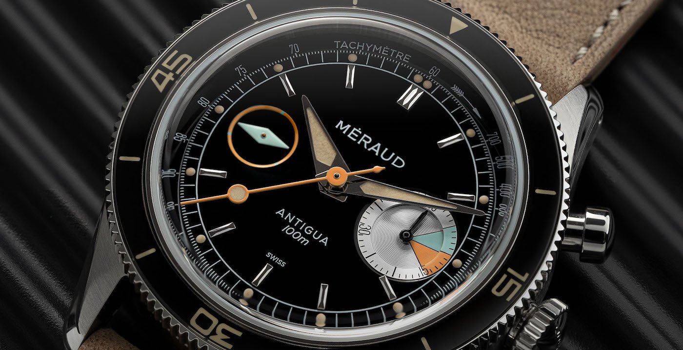 The secret of the Antigua, as with all Méraud watches, is the fusion of vintage classic design with modern innovations. The two-layer dial epitomizes this dichotomy, with its stepped dial referencing the past, while the subdials have a distinct modern look. A tachymeter on the outer step features Art Deco numerals and returns in the “big-eye” 45-minutes subdial.