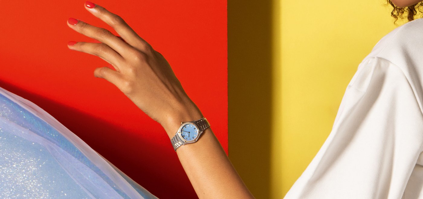 The tranquil blue mother-of-pearl dial evokes a peaceful lightness and luminous clarity and is embellished with gold Roman numerals and diamonds. Completing the dial are the faceted, diamond-polished gold hour and minute hands for an extra-sleek finish.