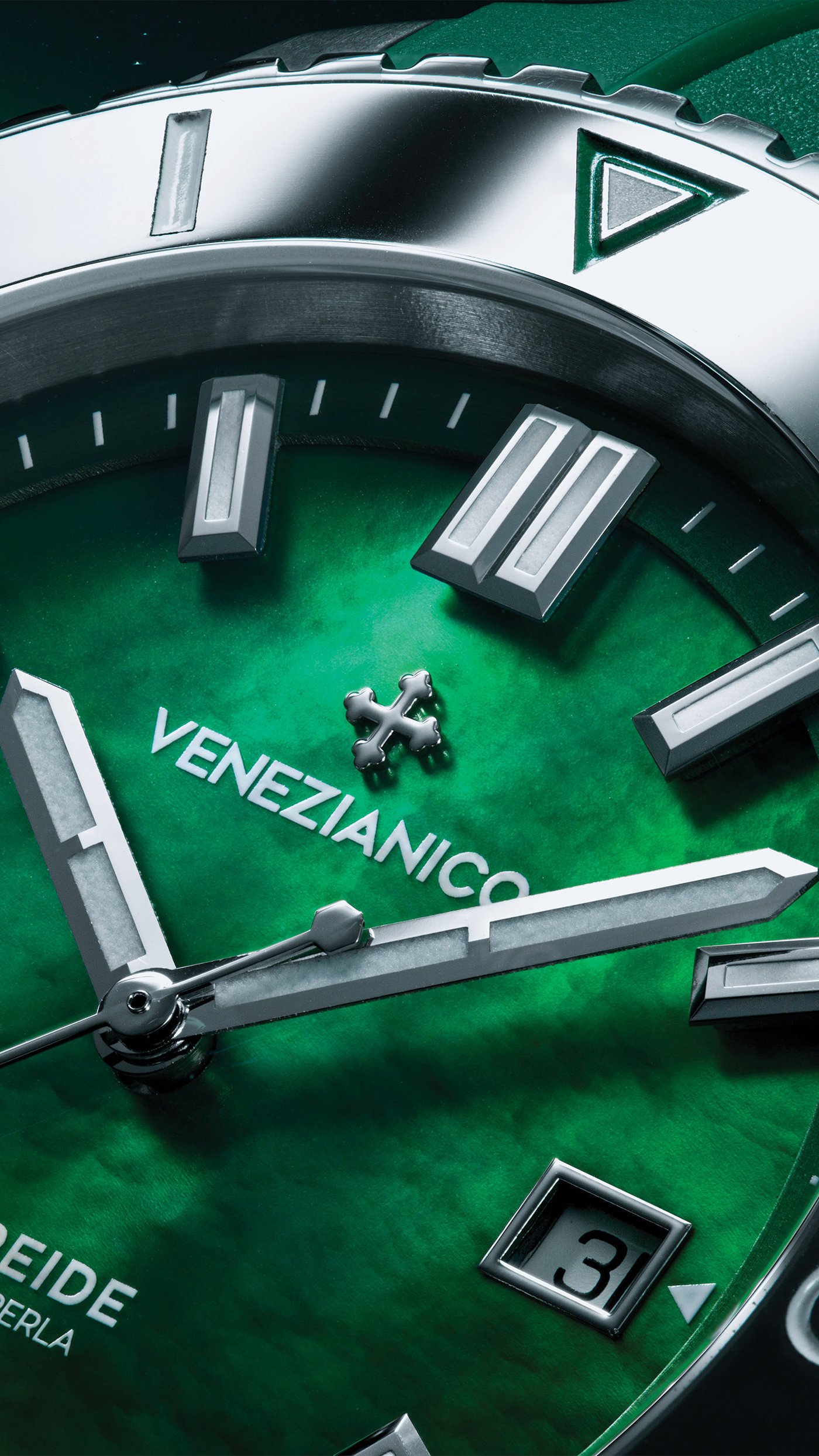 Venezianico celebrates the explorers of the Far North in its most famous diver, Nereide, which evokes all the intensity and mystery of the magical polar nights through the use of a special green mother-of-pearl dial.