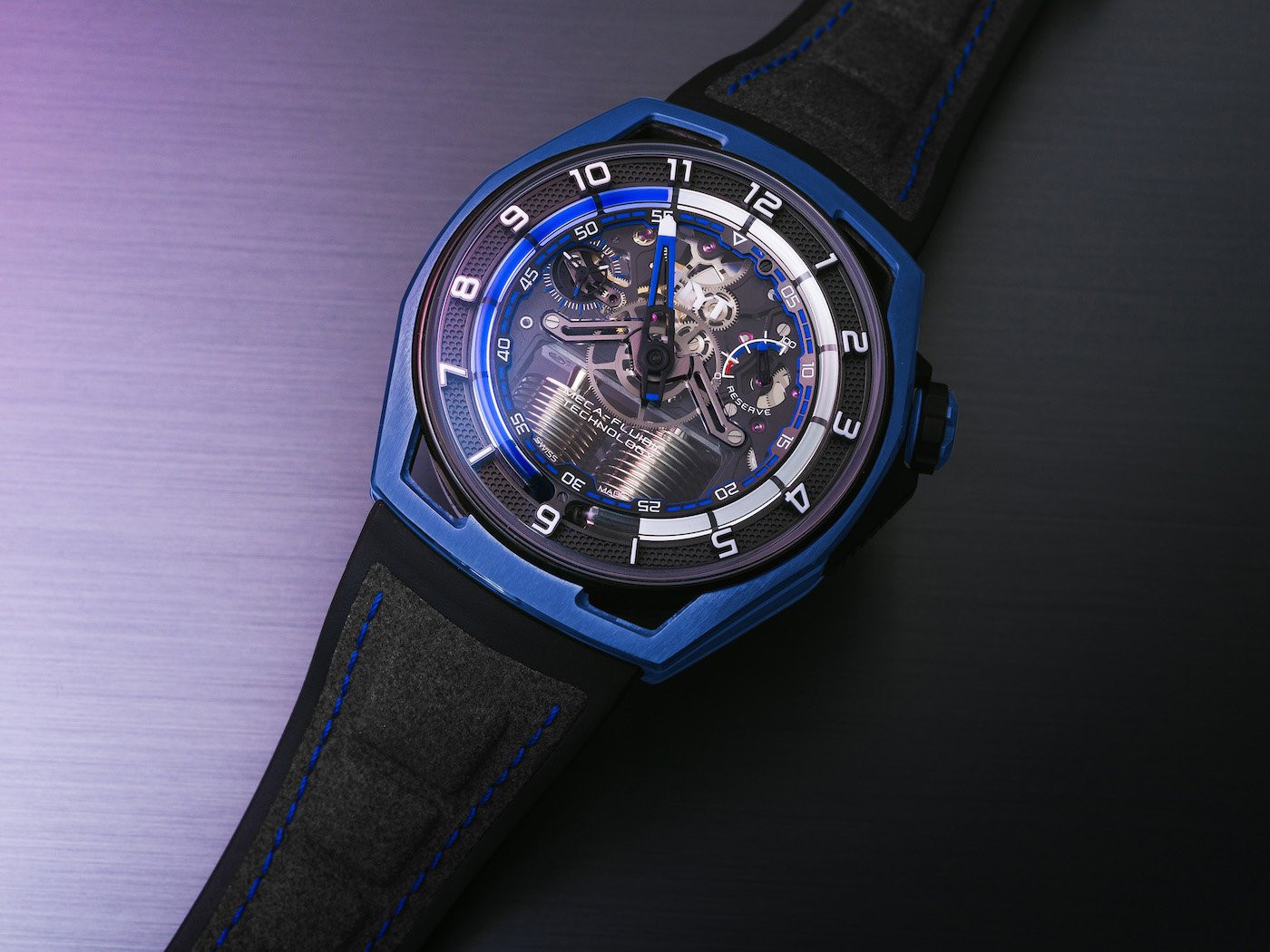 With its hues of electric blue, Hastroid Blue Star’s design defines its own codes, underlining the modern, just-at-the-cusp-of-tomorrow character of the whole. The magnesium case has a special finish with a multi-layer surface treatment, giving it a charged, energized vibe. The exterior shows a metallic blue gradient, darkening on the lugs and becoming lighter as it approaches the center of the case middle.