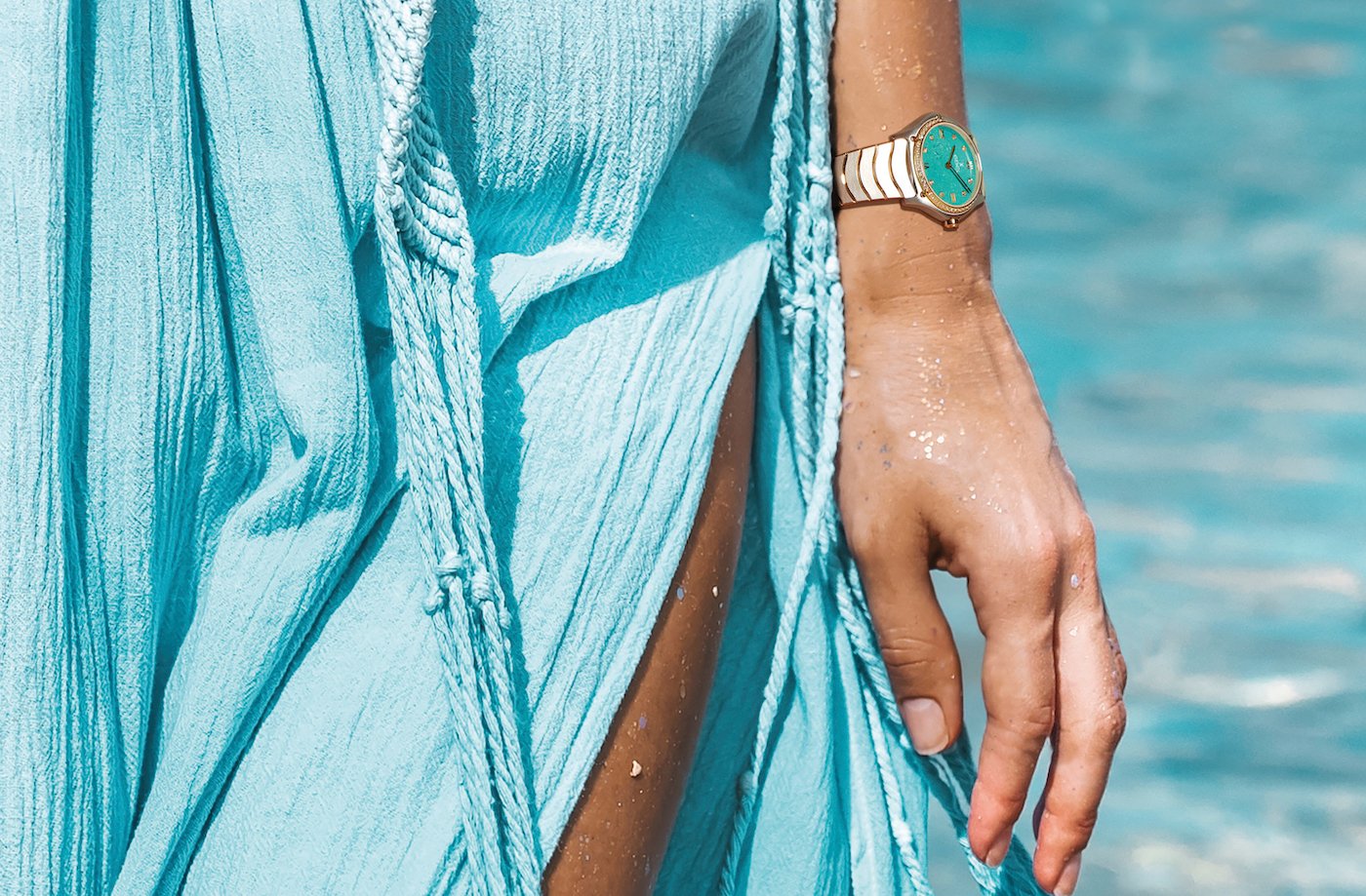 n brushed and polished stainless steel and 18K gold, the case and signature wave bracelet of the new Ebel Sport Classic Lady Turquoise deliver the brand’s promise of eloquent craftsmanship. The turquoise dial is accentuated with polished gold Roman numerals, faceted gold hands, diamond indexes, and encircled by a diamond-set bezel.