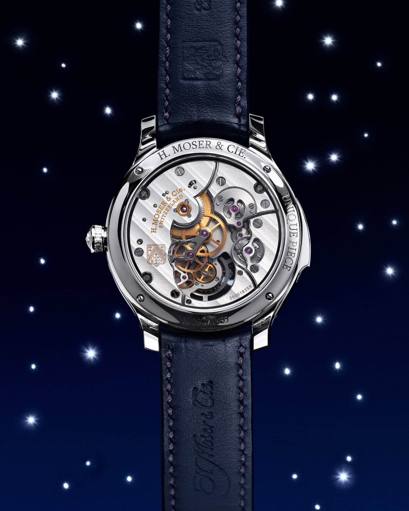 This creation also features a tourbillon at six o’clock, which permits a glimpse of the fascinating inner workings of the watch. Particularly unique is the way in which H. Moser & Cie. has exploited the essence of the minute repeater. True to the minimalist philosophy of the company, the quintessence of this complication has been elaborated and displayed cleverly by making the striking mechanism for the hours, quarters, and minutes visible on the dial side. The transparent sapphire glass case back also allows for a detailed view of the complex movement.