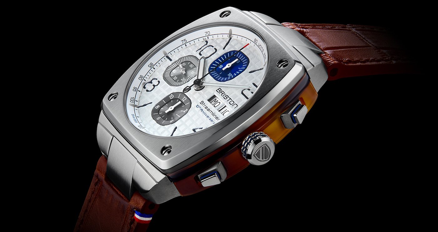 Black or white-silvered upper dial with “waffle” embossed pattern & Briston, Streamliner, 10th Anniversary mentions