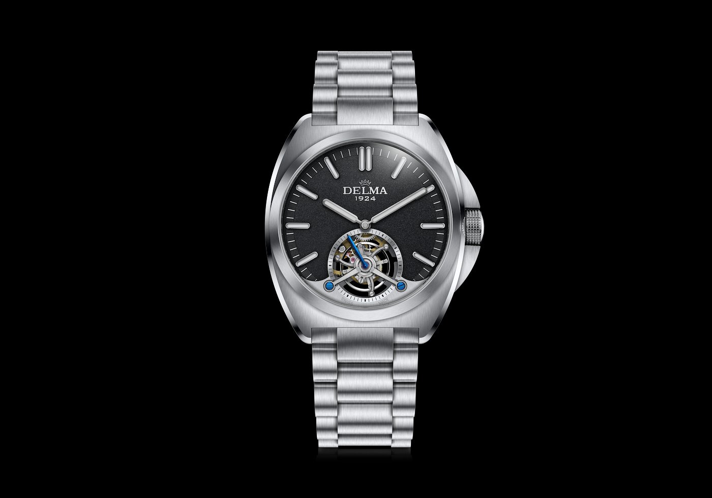 Fitted with a stainless-steel bracelet featuring a deployant clasp, the Delma 1924 Tourbillon is supplied in a sumptuous presentation box containing an additional black Italian leather strap. Quick-release spring bars allow the wearer to switch to the strap, or vice-versa, without requiring the use of tools.