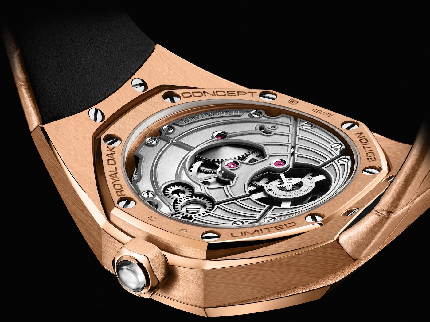 For its part, the caseback’s glareproofed sapphire crystal is held in place by an 18-carat pink gold octagonal frame, finished with satin brushing and polished chamfers and engraved with “Royal Oak Concept Limited Edition.”