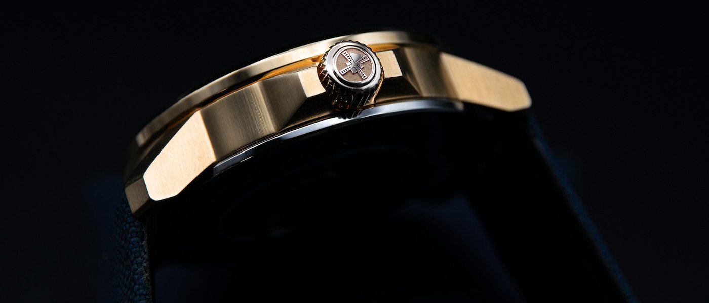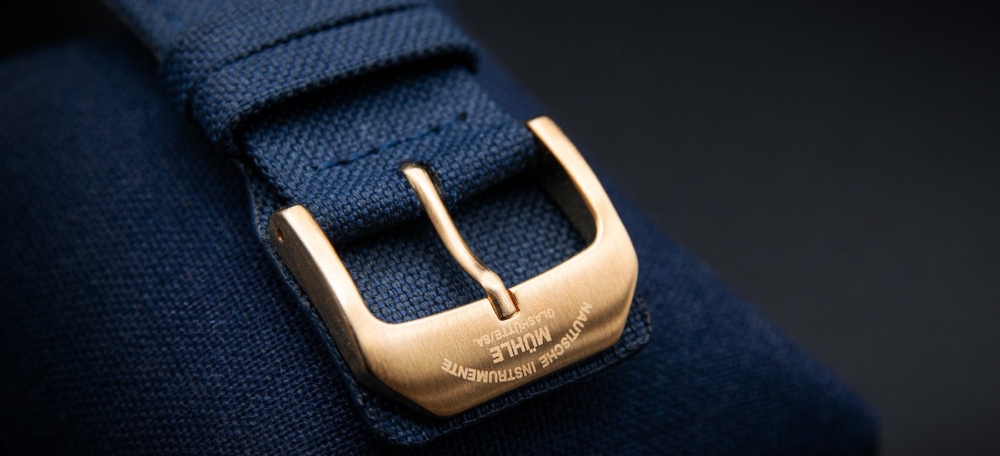 The back of the watch is made of wearer-friendly stainless steel and features a transparent panel. Wearer-friendliness is also the inspiration behind the watch strap, a blue canvas material with a pad on which the bronze pin buckle rests when the watch is worn.