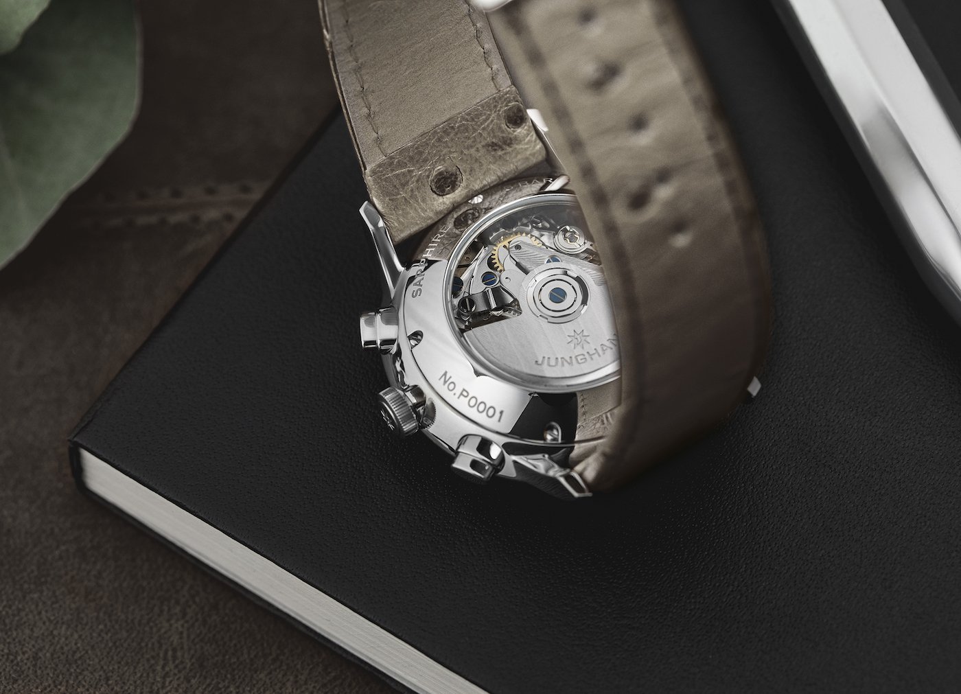 Underneath the crystal, the slightly domed, satin-finished dial is presented in a subdued grey. The dial is characterised by the watch’s timing functionality, which of course includes the possibility to stop sporting times. Its totalisers display the stopped minutes and hours; these and the permanently running small seconds display are bowl-shaped and recessed with a darker grey background to set them apart. This builds a wonderful contrast to the warm grey of the rest of the dial, whose elegant appearance is completed by applied indexes at 3, 6, 9, and 12 o’clock in addition to the harmonious set of hands. The hour and minute hands are diamond-cut and inlaid with eco-friendly, white, luminous substance. Accompanying the time, windows at 3 o’clock also show the date and day of the week – with latter available in a choice of German or English. The Meister Chronoscope comes on a light-grey ostrich skin strap whose color perfectly harmonises with the dial.