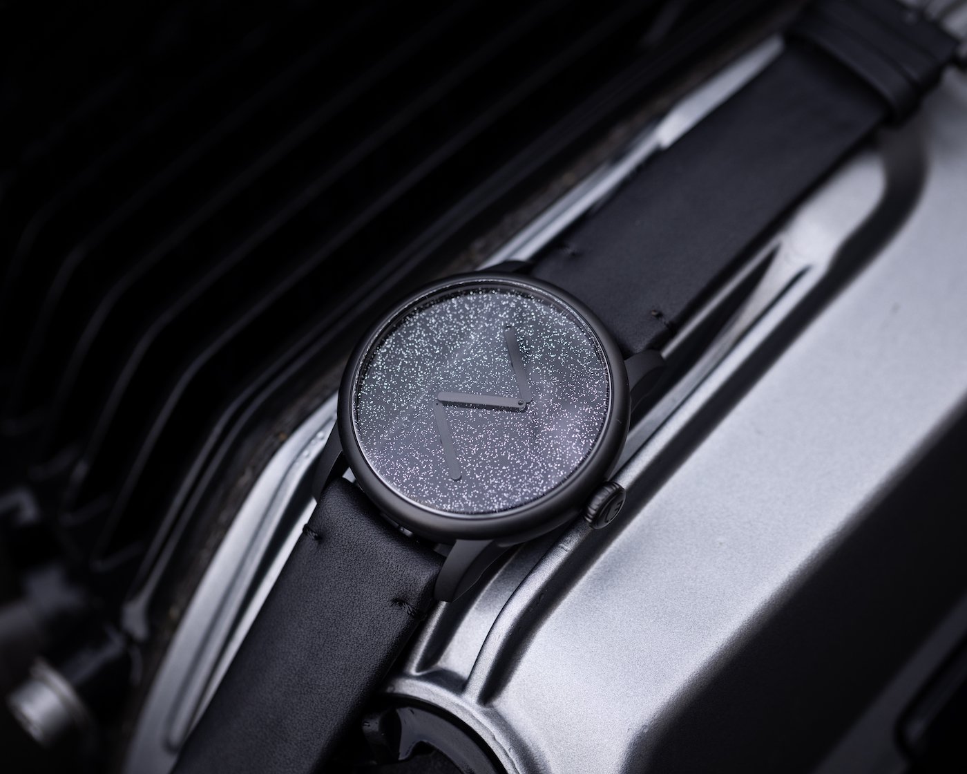 This watch is a frontier. On one side, the land of signs; on the other, the land of watchmaking. This watch is an invitation to cross this frontier on a journey. Of course, Olivier Mosset doesn’t just make art, he’s also a biker, an “easy rider” in the Jura, and an artist in the “watchland”. Everything is black: case, bracelet, hands. It’s a pure work of art, with no labels, no logos. Only the dial contrasts, decorated with silver glitter. The hands are batons, hour, minute, second, three times the same, same length, same width, same rounded ends. There’s just one detail: the size of the hole that gives the direction, a minimalist reference, just enough to ensure that you don’t lose the sense of reading altogether.
