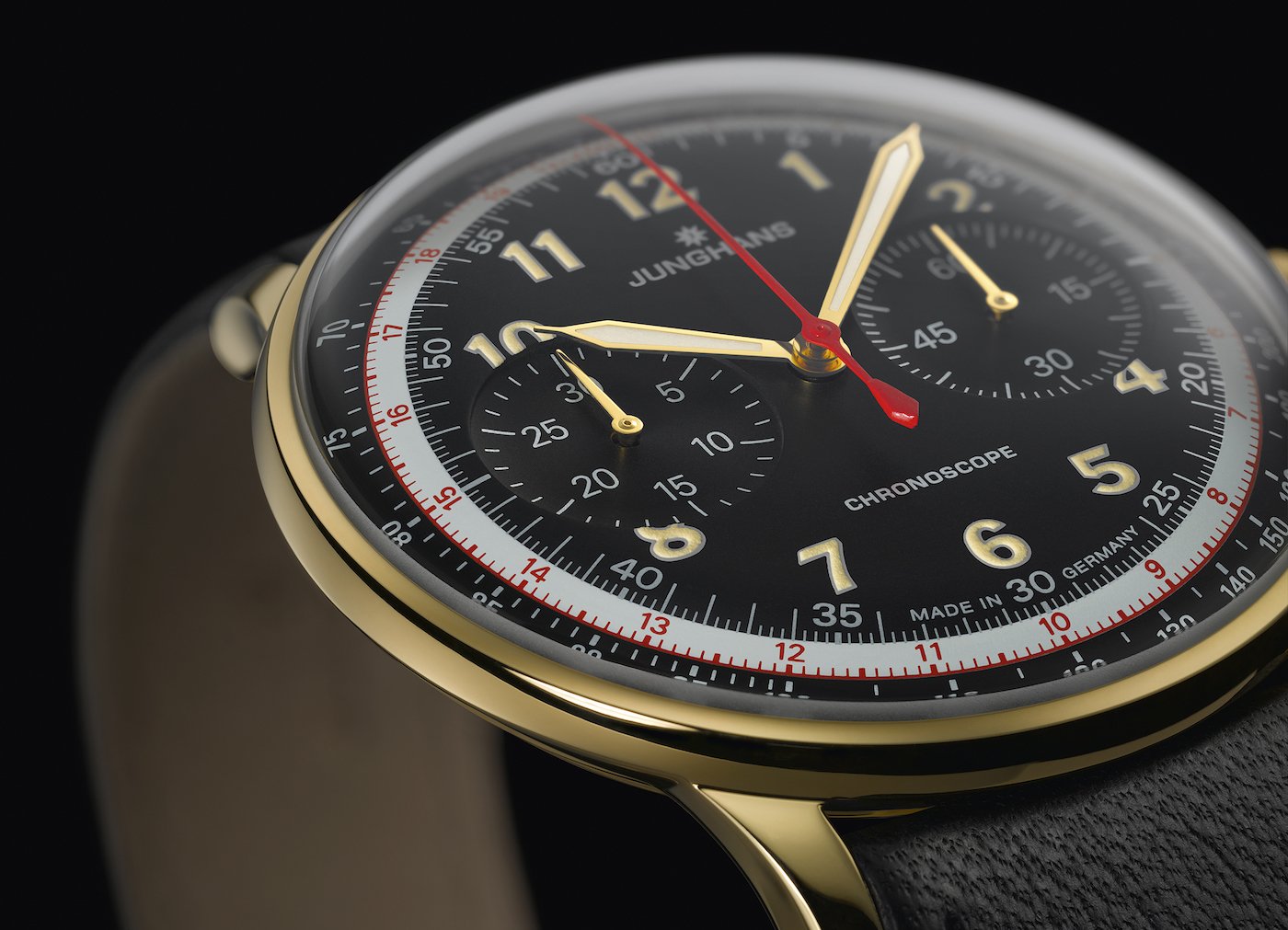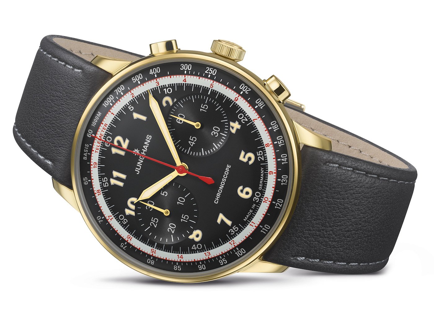 he Telemeter watch is traditional: it was in 1951 that Junghans first presented a chronograph combining telemeter and tachymeter displays. And today, Junghans presents a new interpretation of this historical timepiece recalling the elegant yet sporty look of the classical chronograph of its time: a gold-coloured case combined with a black dial lend this timepiece a modern retro character.