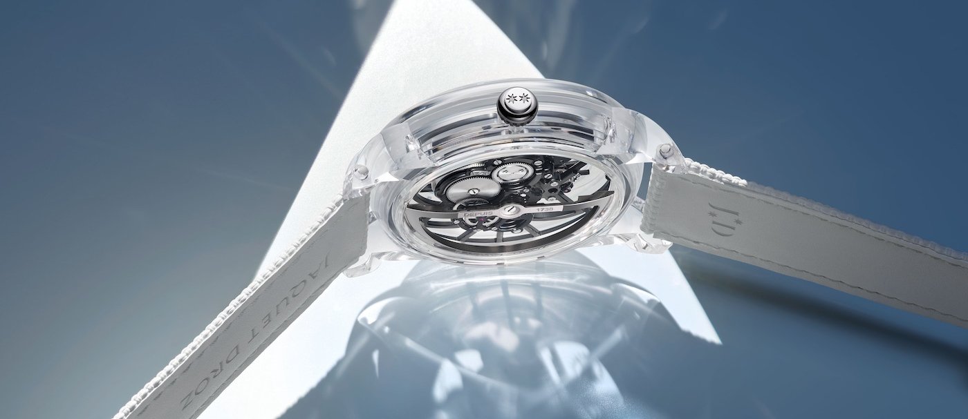It is powered by a Swiss Made precision mechanism. With its signature Jaquet Droz figure-of-eight design, the movement features a skeleton flying tourbillon at 12 o’clock, counterbalanced by the hours and minutes at 6 o’clock. The two are perfectly visible thanks to two openings in the opal, which is just 7/10th of a millimetre thick.