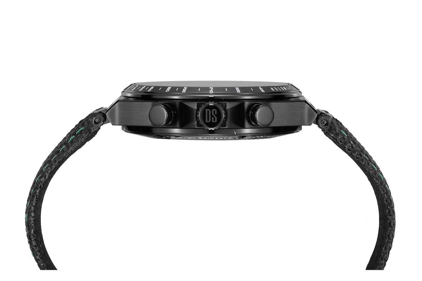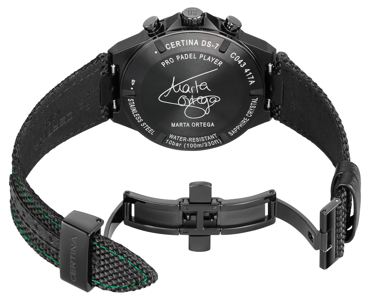 he new DS-7 Chrono Padel Edition by Marta Ortega celebrates her achievements and the vibrant spirit of this fast-paced, popular and exciting sport. The black PVD coated stainless steel case frames a dial made from carbon fibre – the same material used in Marta’s padel racquet. The padel connection is further highlighted by a subtle detail on the dial: a small padel tennis ball at 6 o’clock.