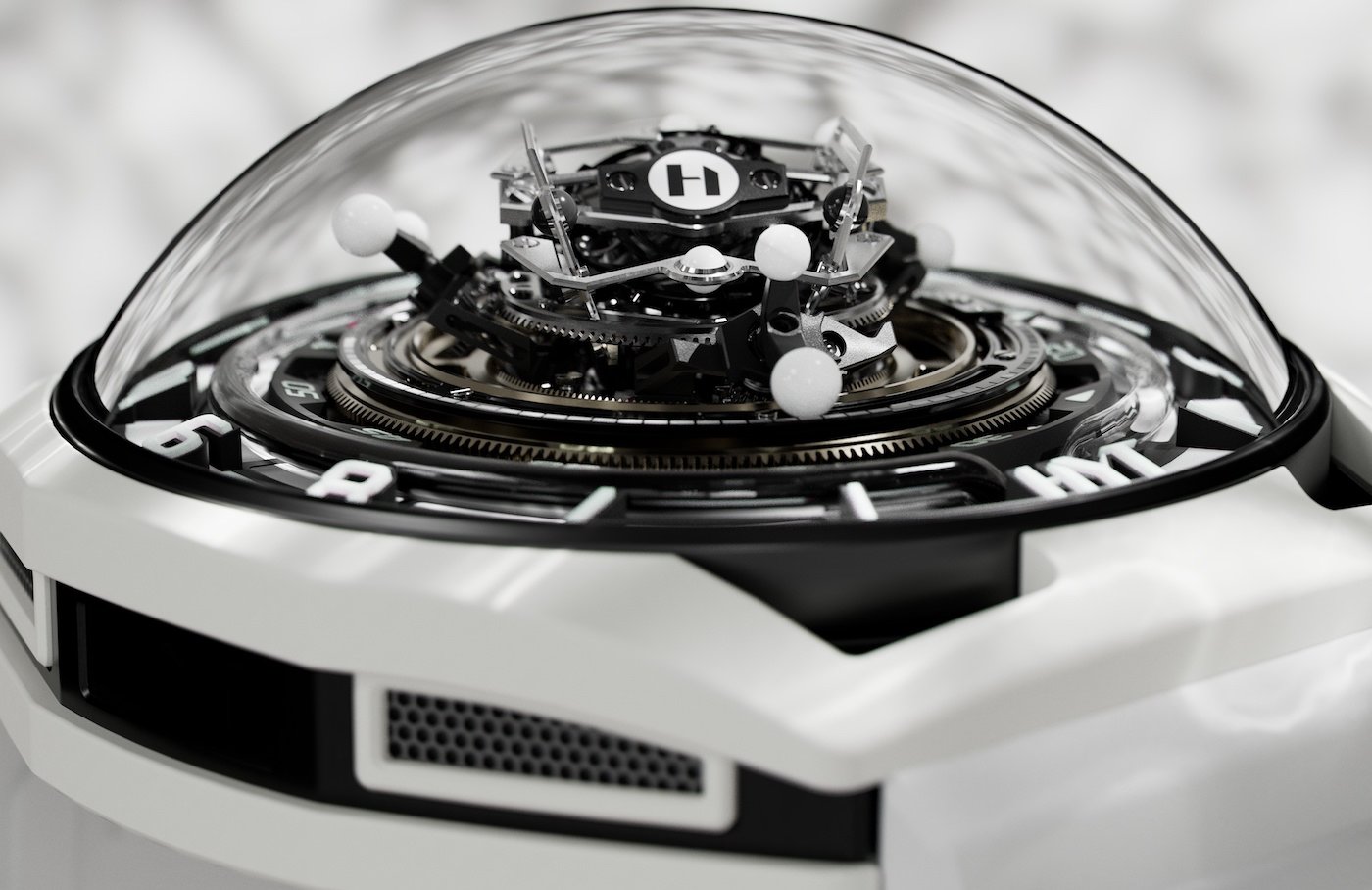 - 3 spheres in white agate gemstone, 2.5mm in diameter, with one counterweight each; in the tourbillon cage: 6 spheres, 1.5mm in diameter (2 in white, 4 in black)