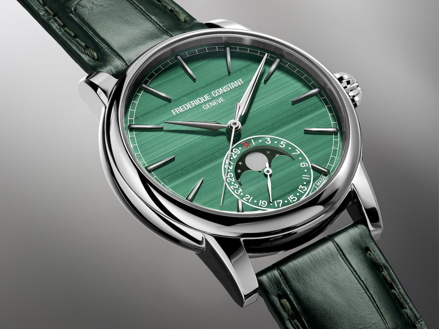 arking the most dramatic revamp of the Classic Moonphase Date Manufacture watch since its inception is this super-rare, limited-edition white gold series by Frederique Constant. Combining the date and moonphase into one sub-dial, this creation features redesigned hour markers and hands that glide, for the first time, over a malachite dial.