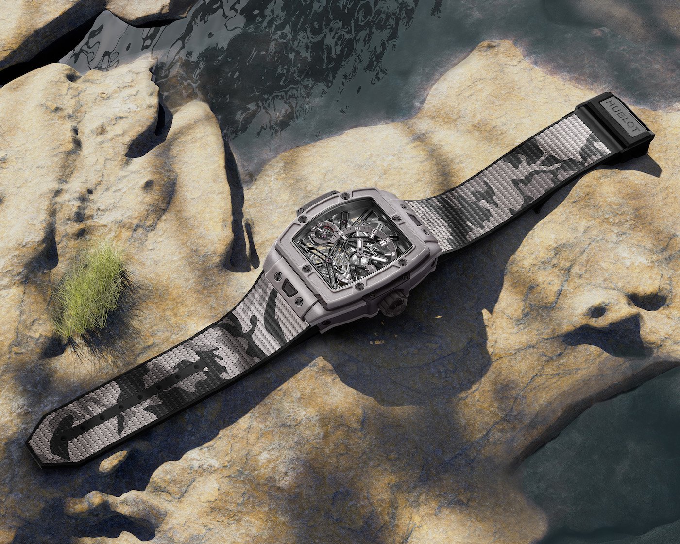 The Hublot Spirit of Big Bang Sorai is the fourth watch created in support of Sorai, and the first Spirit of Big Bang. Its 42mm case is cast in the same micro-blasted and polished “warm grey” ceramic created by Hublot for Sorai to capture the distinctive colour of a rhino’s skin and first seen in the Big Bang Unico Sorai 2023. The watch is set on a grey fabric strap and supplied with a second strap in black rubber with a striking grey and beige camouflage pattern. Powering the watch is the HUB6020 Manufacture calibre, a hand-wound, skeletonised tourbillon with a five-day power reserve. It provides the watch with an asymmetrical display that sits poised between two sapphire crystals and that delicately balances a time display at 3 o’clock and a power reserve indicator between 8 and 9 o’clock. The Spirit of Big Bang Sorai will be limited to 30 pieces.