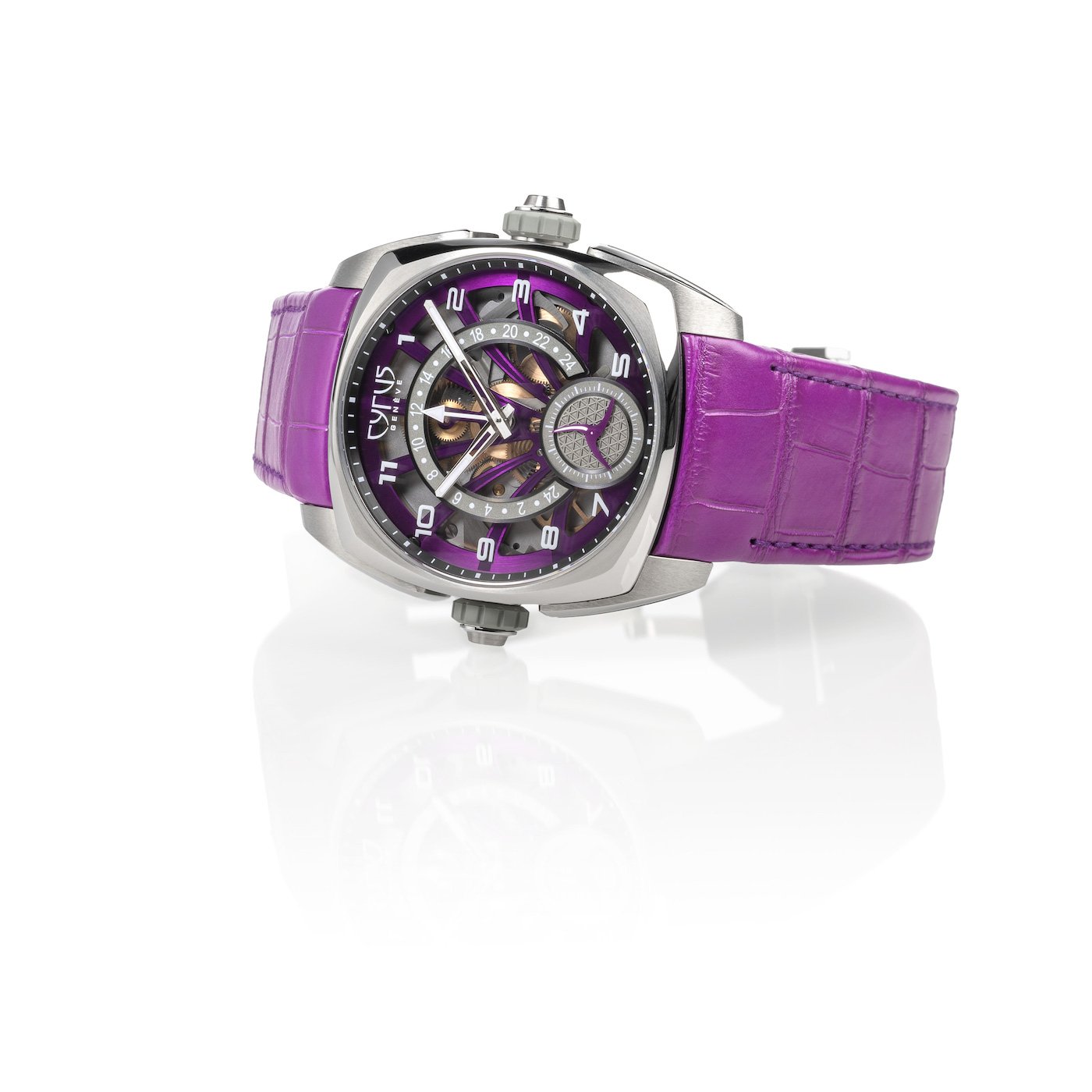 The Klepcys GMT Royal Purple is powered by the in-house self-winding calibre CYR708, designed by Jean-François Mojon and that can be admired through the sapphire crystal glass porthole. Its regulating organ operates at 28.800 vibrations per hour (4 Hz) and guarantees 55-hour power reserve, provided by a single winding barrel.