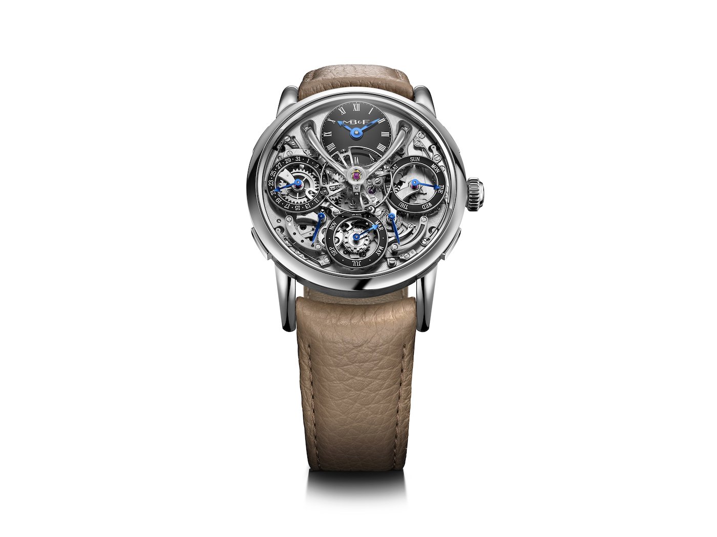 - Fully integrated perpetual calendar developed for MB&F by Stephen McDonnell, featuring dial-side complication and mechanical processor system architecture with inbuilt safety mechanism.