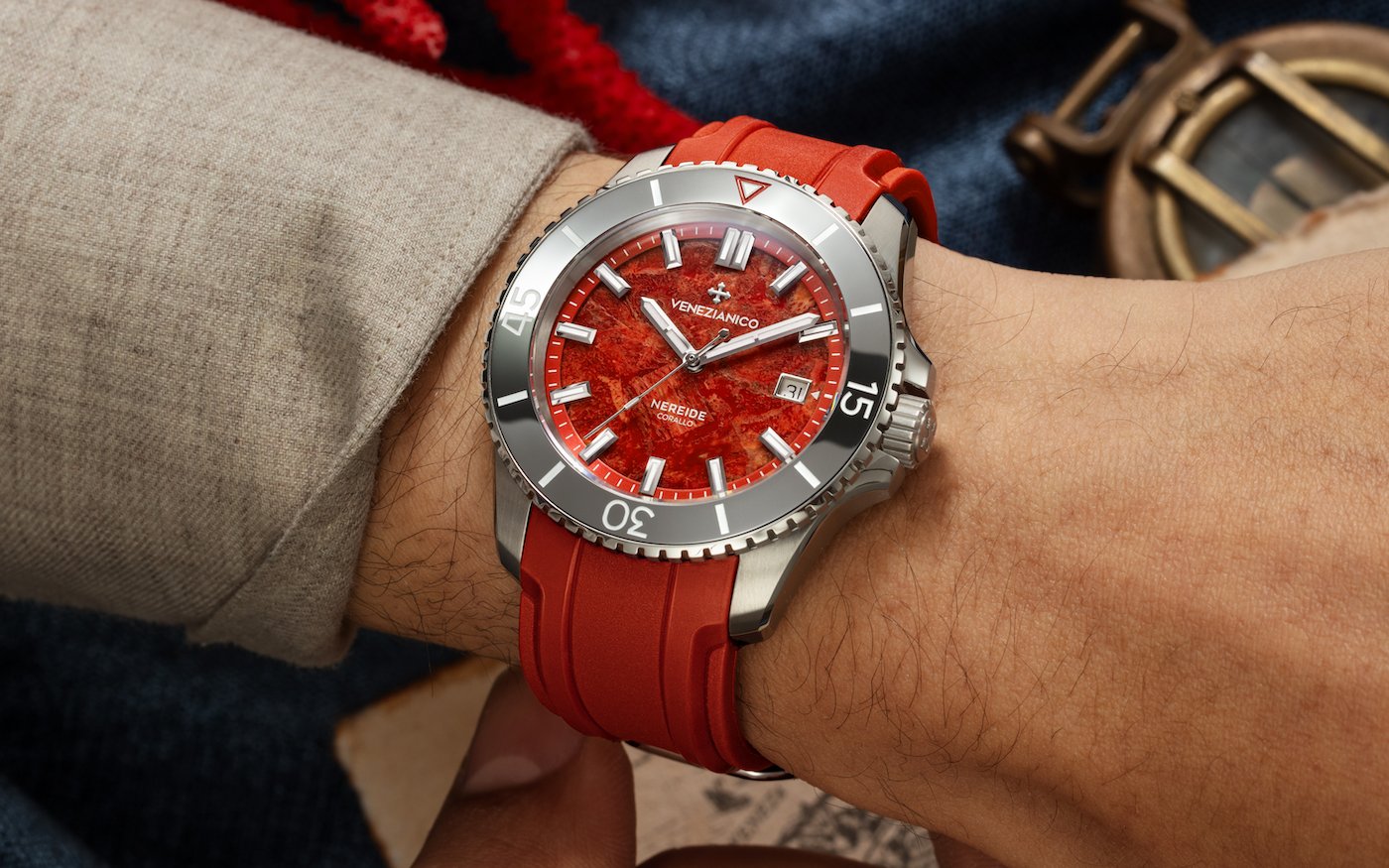 At the heart of this long-standing tradition lies Nereide Corallo, the latest creation from Venezianico: a diving watch that pays tribute to the historic bond between Venice and this captivating material—symbolically represented in Giambattista Tiepolo’s fresco Neptune Offering Gifts to Venice, where the sea god presents coral to the Serenissima as a sign of prosperity and maritime power.