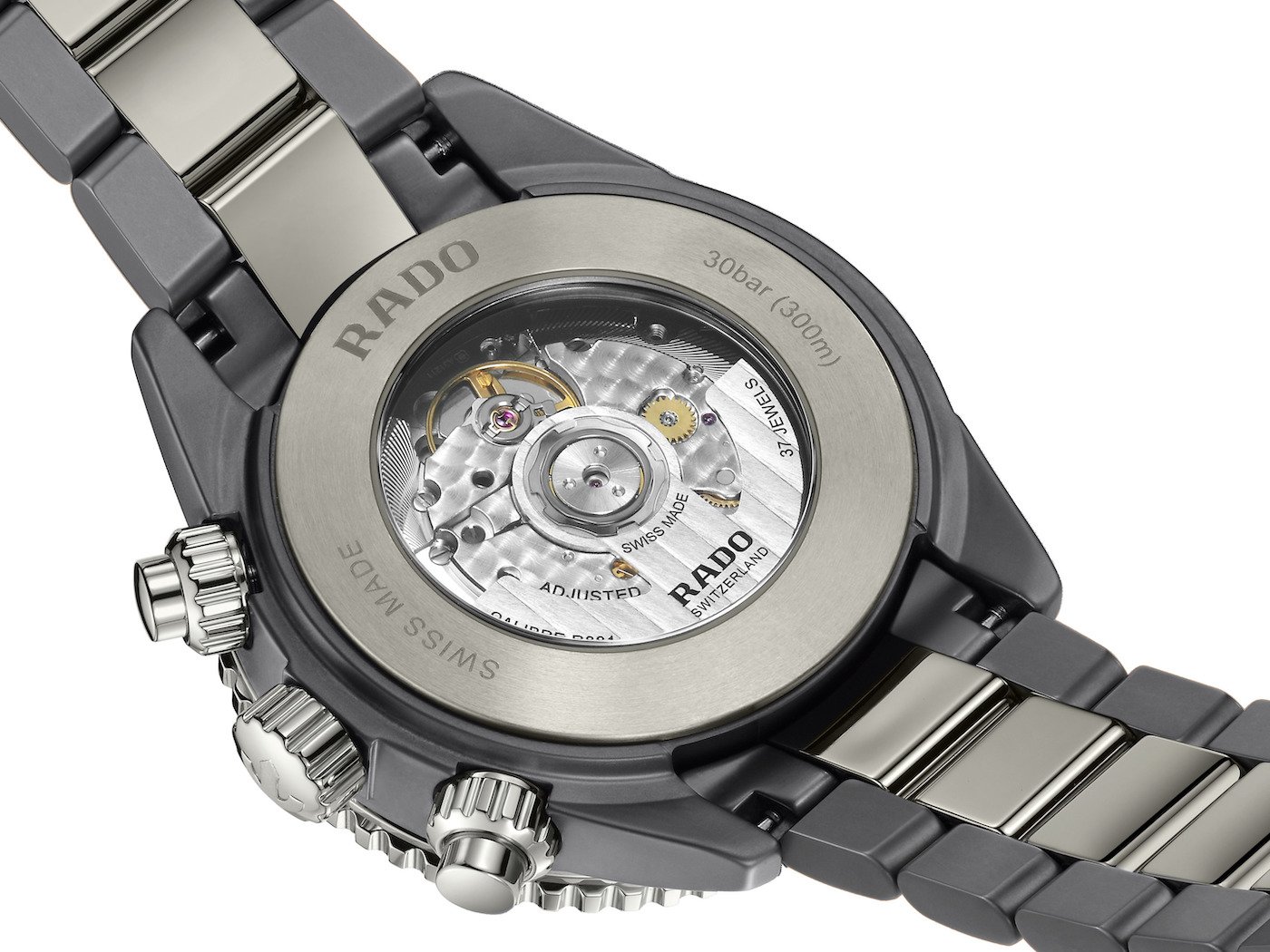 - Rado calibre R801, automatic chronograph, 37 jewels, 5 hands, date at 6 o’clock, 59-hour power reserve, antimagnetic Nivachron™ hairspring, exceeds standard test requirements from 3 to 5 positions for higher accuracy