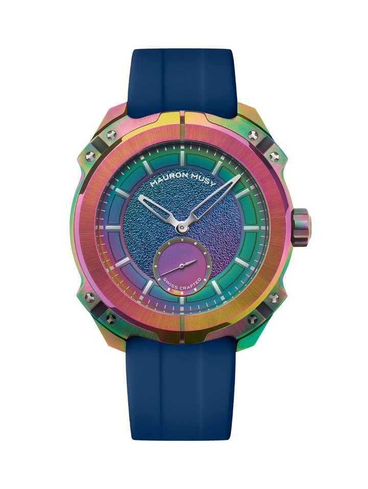 Initially designed to withstand the extreme demands of aerospace and motorsport, a high-performance coating, based on a carbon structure, finds a new purpose in avant-garde watchmaking. When metal comes into contact with the coating elements, it reacts, revealing a palette of unpredictable iridescent reflections, as if each watch possessed its own mineral fingerprint. A unique visual signature. At the heart of the 41mm MU06 Mayura beats the MM02 calibre, the brand’s first in-house micro-rotor movement.
