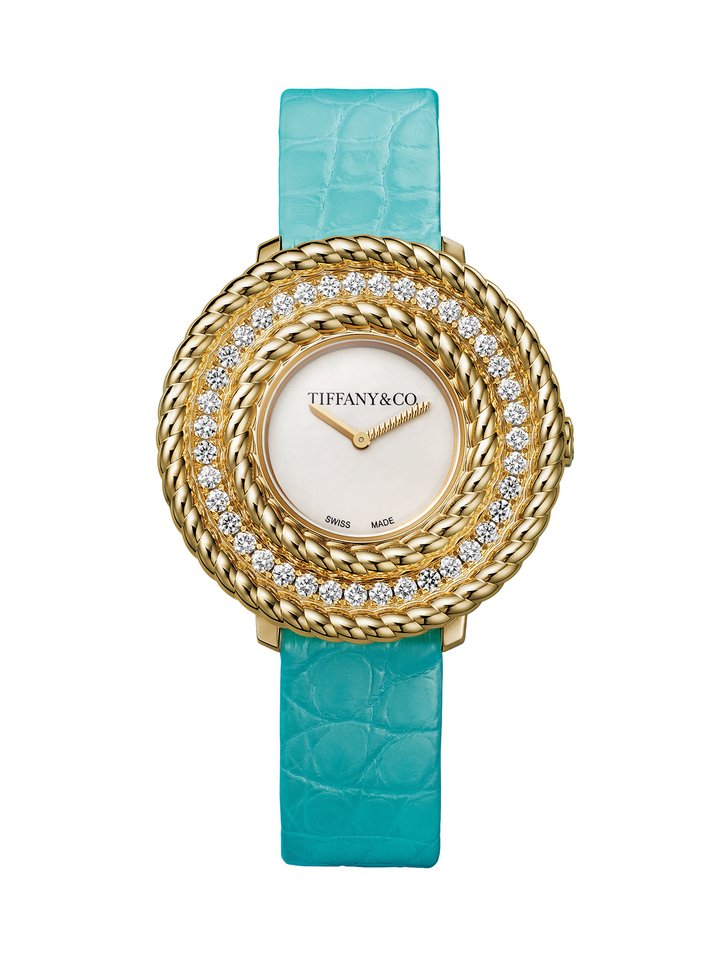 The twisted gold motif that defines the Rope jewellery collection, imagined by legendary designer Jean Schlumberger, has been translated into a timepiece that features Tiffany & Co.’s first solar-powered movement. In a 27mm or 33mm case, the watch is presented in 18k yellow gold with the option of a white mother-of-pearl or glossy black dial. The wide bezel surrounding the dial is highlighted by two circles of polished gold rope separated by a ring of round brilliant diamonds. This rope motif is repeated on the minute hand.