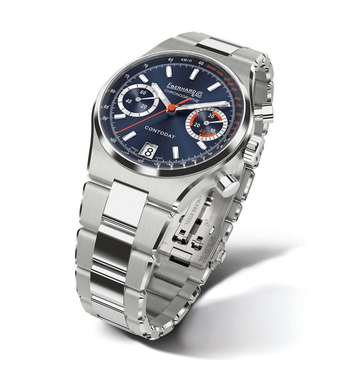 This new sporty and elegant collection consists of the Contodat Automatic and the Contodat Chronographe. Both variants are offered with a carefully curated selection of dials and represent the first watches in the current collections to be exclusively designed with an integrated bracelet. While the name revives the historic Contodat brand (registered in 1955) in a fresh new form, the collection takes inspiration from a timepiece from the second half of the 1970s, conceived by then President Palmiro Monti: one of the first mechanical chronographs of the “new era” for the Maison, featuring striking lines and an intriguing colour scheme, highlighted by a contrasting orange seconds hand.