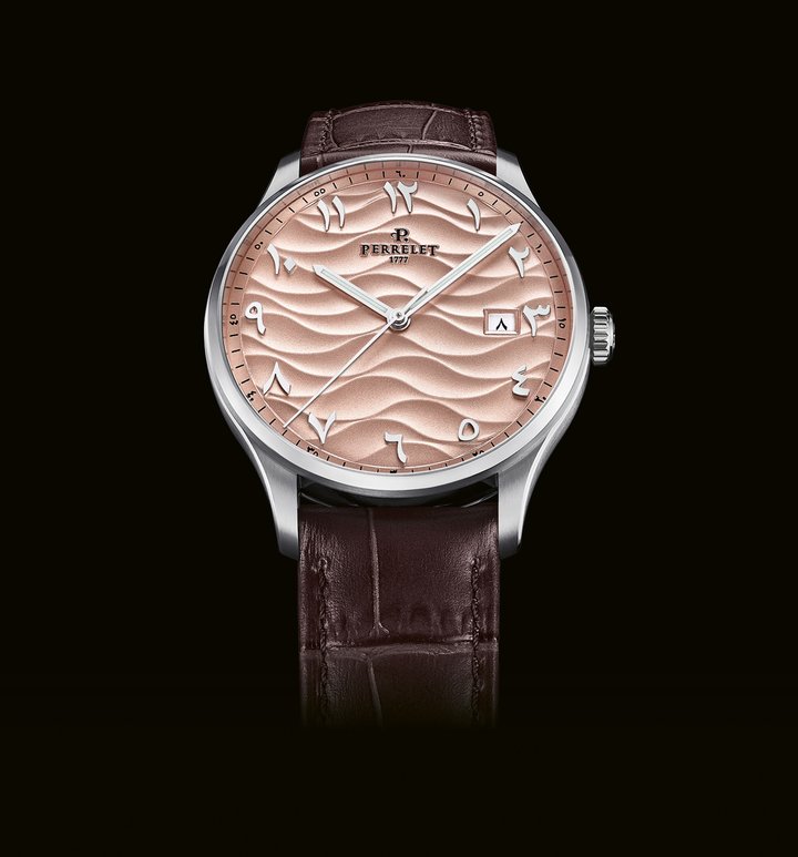 The highlight of the new 39mm Weekend Sand Dunes is undoubtedly the dial, which portrays the breathtaking scenery of the Arabian Desert. The embossed dunes in Pantone colour 727C – a faded light brown that turns to salmon pink – add dynamism and depth to the timepiece. In keeping with the Arabian theme, the silvered applied hour indices, minutes flange and date in the window at 3 o’clock are displayed in Arabic. The Weekend Sand Dunes with time-and-date functions is driven by the Perrelet P-321 calibre that guarantees a 42-hour power reserve.