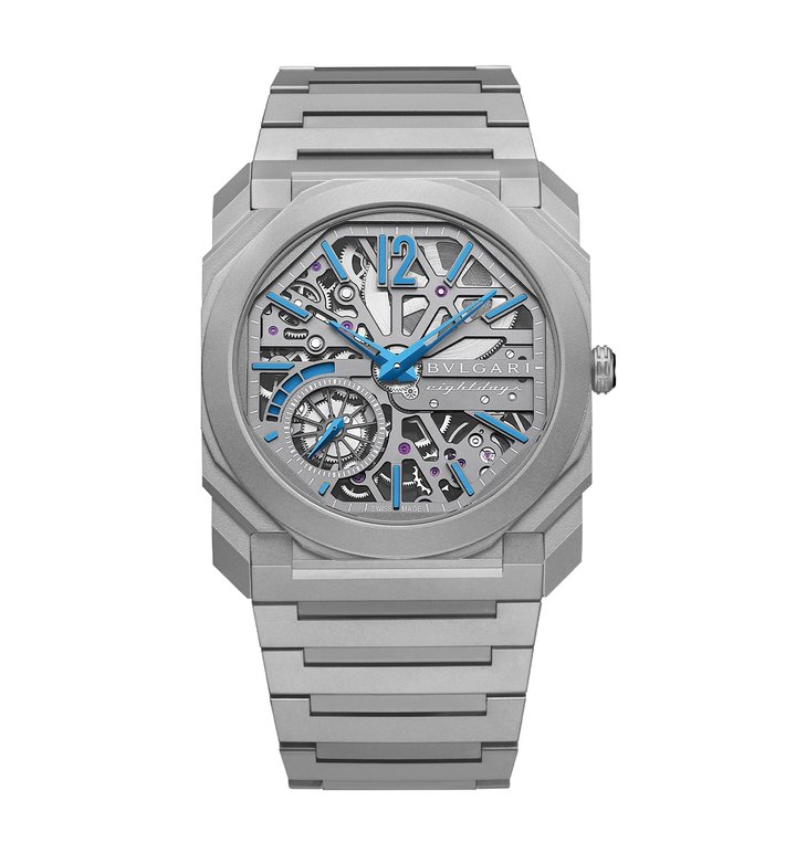 This special edition reinterprets one of Bvlgari’s most emblematic creations with striking blue accents developed solely for Swiss retailer Gübelin. The luminous blue hands and indices inject a daring vibrancy into the architectural precision of its skeletonised dial – revealing the inner workings of the hand-wound calibre BVL 199 SK, a marvel of mechanical elegance that is just 2.50mm thick. Boasting an exceptional 8-day (192-hour) power reserve, this ultra-thin movement exemplifies Bvlgari’s mastery of miniaturisation and mechanical artistry. The 40mm octagonal titanium case, enhanced by a crown set with a black ceramic insert, is paired with a matching titanium bracelet secured by a folding clasp.
