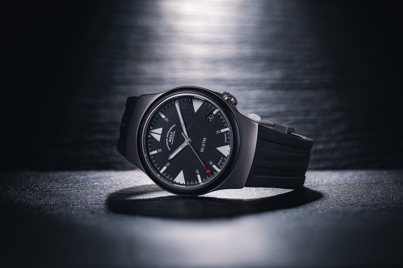 The dial, finished in titanium gray, features both a functional minute track and a fine line structure. This design element makes reference to the location of the German Maritime Rescue Co-ordination Centre at the DGzRS headquarters in Bremen and depicts the topographical isolines of the North Sea near the mouth of the Weser River in Bremerhaven. The red tip on the second hand is another special feature: This DGzRS-specific color can also be seen on the indices, which appear white during the day. In the dark, the indices glow navy blue and reveal their mysterious red hue under UV light.