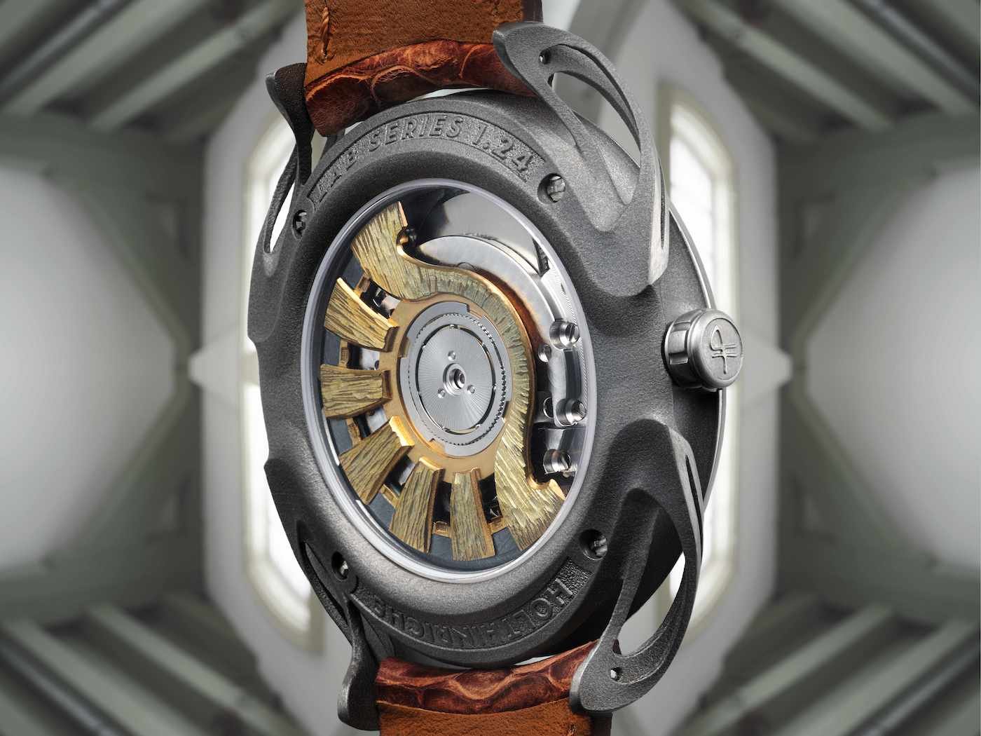 A standout feature in the LAB Series 1.24 is again the ultra-thin structural design of the 3D-printed case. This time, however, the Holthinrichs specialty patina dial is embellished with 24-carat leaf gold, applied by Chris Alexander, a.k.a. The Dial Artist.