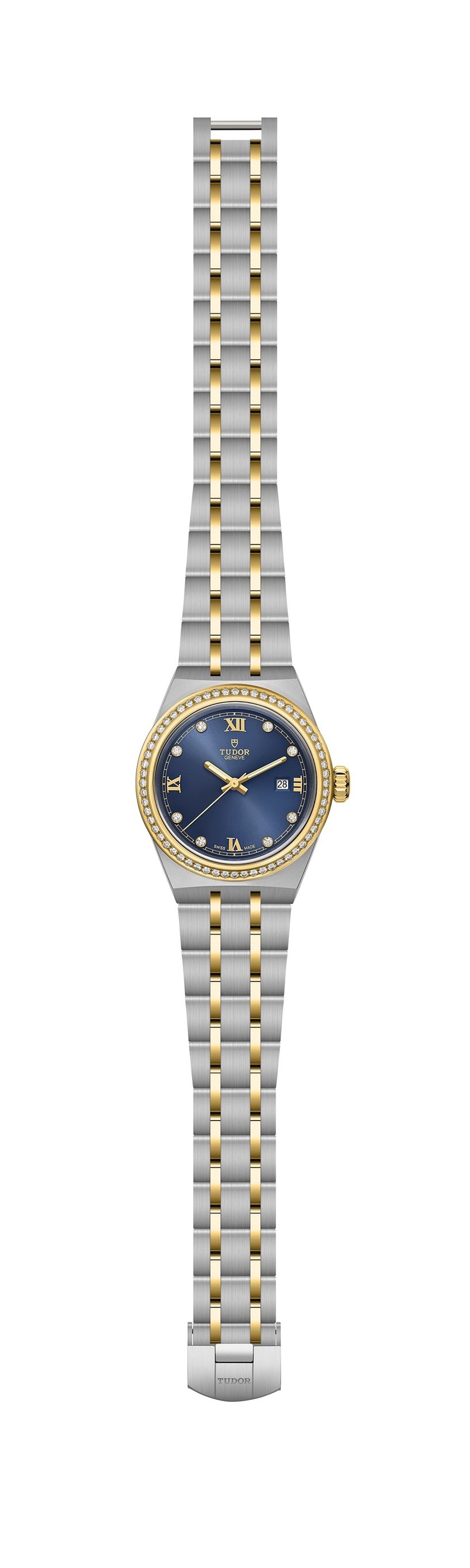 There is the Royal, a longstanding Tudor model with an air of elegance that’s been refined for decades. Now an exclusive model with a dial in a distinct hue of blue joins the range. This striking new dial accentuates the 28mm Royal with a diamond-set bezel exclusively, both the stainless steel and the S&G configurations, adding a distinctive touch of nobility to the already regal range.