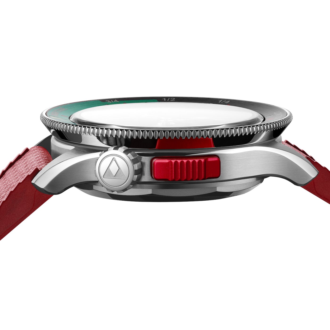 Just beside it, at 9 o’clock on the case flank, sits a red aluminium pusher—subtly integrated into the design. This placement allows it to be naturally operated by the thumb, widely regarded as the most efficient digit for engaging a chronograph. Its generous dimensions make activation effortless, while lending the watch an additional touch of individuality .