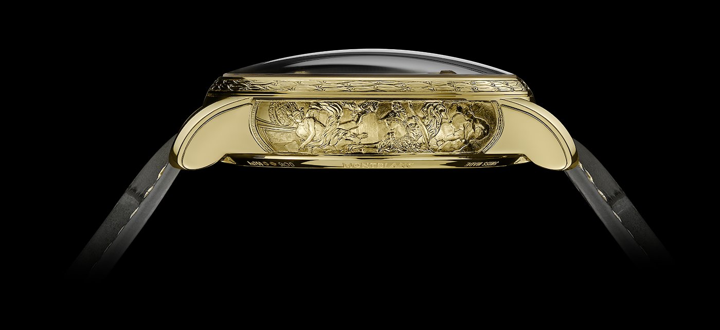 A further heightened expression of haute horlogerie arrives with the yellow gold 750/1000 (18 karats) case of the Montblanc Star Legacy Suspended Exo Tourbillon Château de Versailles. A hand-engraved laurel wreath—long associated with Apollo in ancient Greece and still used around the world today to symbolise victory—adorns the bezel. Montblanc’s hand-engravers have also set a different, yet still relevant, narrative into the intricate caseband engraving. In this engraving, we find a recreation of a painting by François Lemoyne from the Salon de la Paix at Versailles in which Louis XV is offering an olive branch to all of Europe, while above him Minerva— the namesake of Montblanc’s historical manufacture and the Roman goddess of arts, war and justice—instructs Mercury to keep closed the Gates of Janus, a reference to the practice during the Roman Empire of closing the gates of the Janus temple during times of peace, a symbol of stable boundaries. This painting casts Louis XV as a Roman Emperor, something very much in vogue as Neoclassicism asserted itself throughout Europe during the Enlightenment.