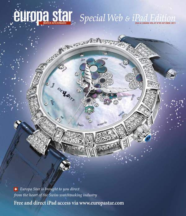 18-carat white-gold case, 39mm diameter. Set with a total of 412 brilliant-cut diamonds (2.99 carats) on the case middle, bezel, lugs and the crown, which is also adorned with a sapphire cabochon. Mother-of-pearl dial with partially diamondset floral decoration, stylised hands and French script hours. Self-winding movement with 42-hour power reserve and personalised DeWitt rotor. Blue alligator leather strap. Water resistant to 30 metres.