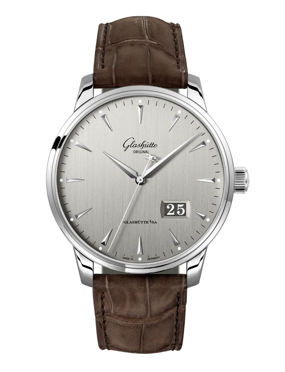 Automatic winding, hour/minute/second (central), Panorama Date, second stop, exquisitely finished movement, polished steel parts, polished/blued screws, three-quarter plate/balance cock/rotor with Glashütte stripe finish, skeletonized rotor with 21-ct gold oscillation weight, adjustment of rate by adjustment screws, fine adjustment of rate symmetry by swan-neck spring.