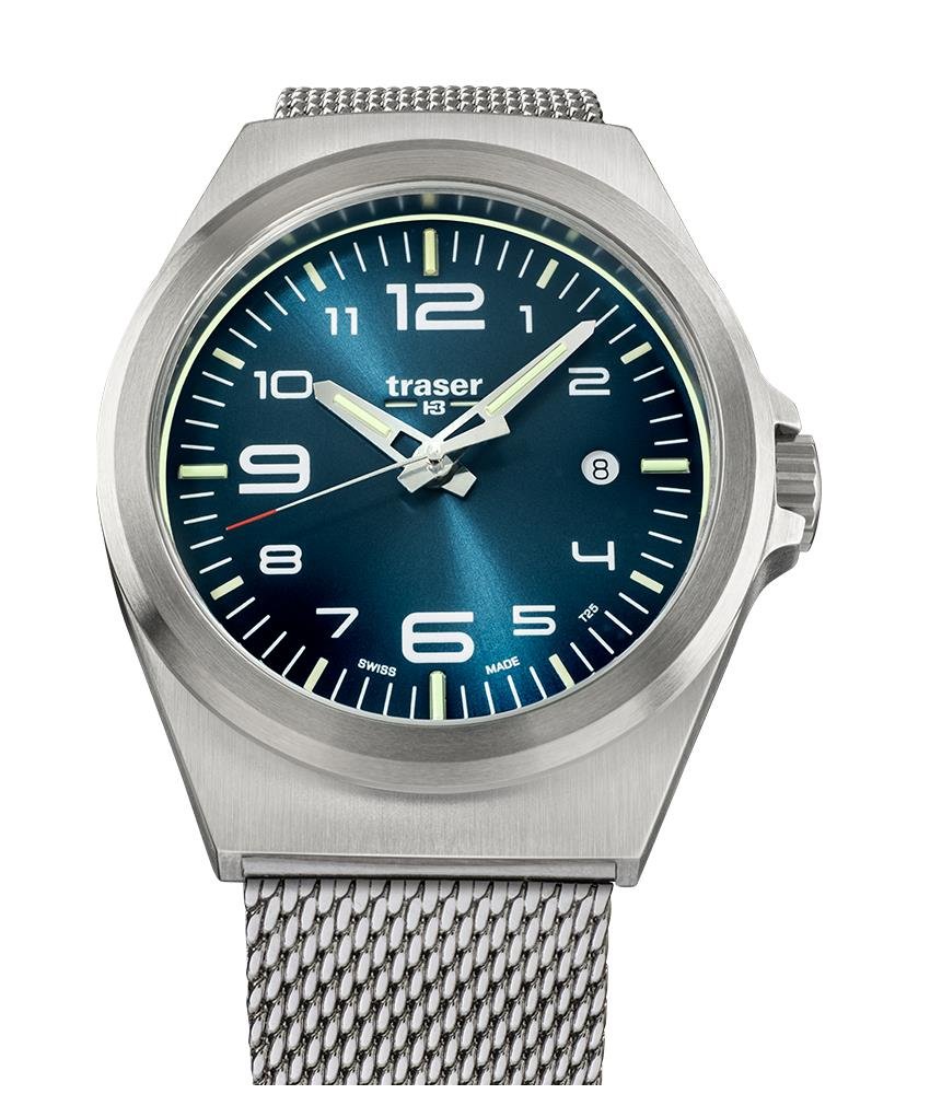 Illumination: trigalight® self-powered illumination technology at ’’12”, ’’3”, ’’6” and ’’9 o’clock”, as well as on the hour and minute hands and below the traser logo - Super-LumiNova for all hour numerals and indexes at ’’1”, ’’2”, ’’4”, ’’5”, ’’7”, ’’8”, ’’10” and ’’11 o’clock” - Luminescent print around the dial - Movement: Swiss Made quartz movement, date window at ‘’3 o’clock” - Water Resistance: 10 ATM / 10 bar