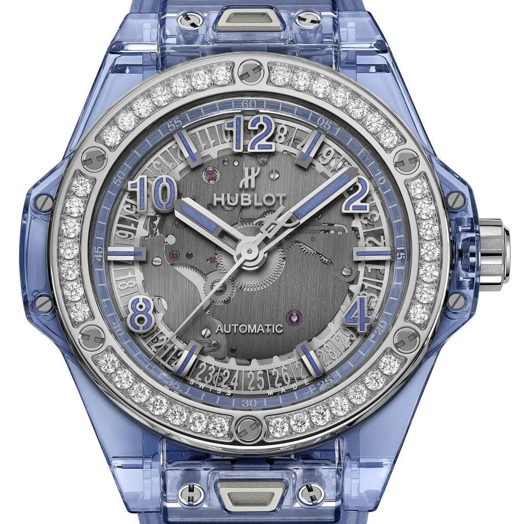Its 39mm case takes on the shades of sapphire, also available in pink and sky-blue hues, using a subtle fusion of aluminium oxide and titanium oxide Which creates the pink tone or iron oxide creating the creating sky blue. The bezel, set with 42 diamonds, dazzles with the brilliance of one carat of precious stones. The strap matching perfectly presents a striking unity of colour. The patented “One Click” attachment system, combines the extreme resilience of sapphire, and its magnetic beauty, with an interchangeable strap.